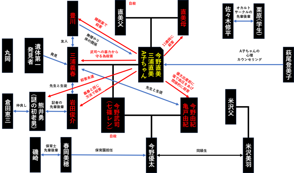 今野直美は母、三浦義春、岩田俊介、豊川を殺害し、今野由紀を間接的に殺害、結果的に息子の武司を自殺させ、熊井を刺し殺そうとしました。