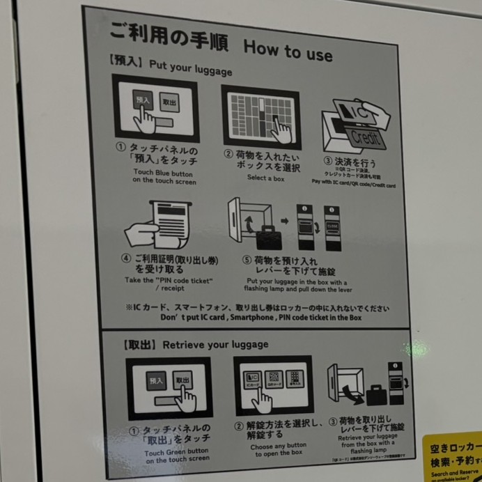 コインロッカーの使いかたは側面に書いてありますが、先にタッチパネル操作して場所を選ぶタイプです。