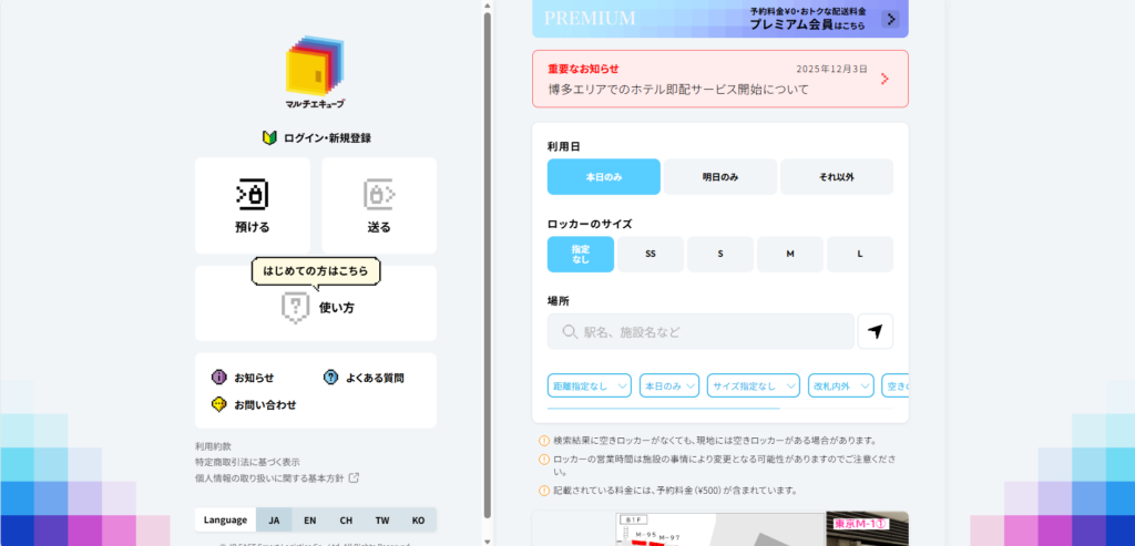 マルチエキューブというサイトでコインロッカーの空き状況確認とネット予約をすることができます。
